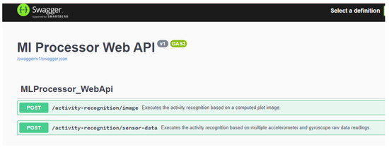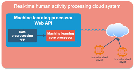 The “Data preprocessing app” handles the conversion of raw movement data from an accelerometer and gyroscope to a plot image. This conversion transforms a movement data window to a single image that will be used as input for the machine learning algorithm. The “Machine learning core processor” represents the main computing logic that is a machine learning implementation trained using the previously generated movement images. After training, this component is capable of receiving an image and predicting its source activity. This behavior is supported only locally, as this component does not support network interactions or advanced conversions from raw data to images. The “Machine learning processor Web Api” is the component that incorporates the “Machine learning core processor” and is able to support network connections and recognize human activity. The recognition process can be based on a generated image but this component is also able to generate the image itself based on raw accelerometer and gyroscope data. So, in order to recognize what activity a series of movement data is part of, a simple API call is sufficient. The “Real-time Cloud human activity recognition system” represents the “Machine learning processor Web Api” cloud correspondent, which is able to handle requests from multiple computer networks via the Internet. This component is not limited to a single local network and can be easily scaled and enhanced for the human activity recognition process. In this way, we can easily recognize real-time human activity from any source application that can make a web API request that contains movement data.