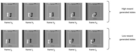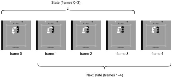 The proposed framework is tested on the Atari Learning Environment (ALE) [47]. The preprocessing steps described in [48] are executed before training the models (Section 5.1), similarly to most recent works in the literature. Thus, each state is represented by four grayscale consecutive frames, which are cropped to pixels. Consecutive states are overlapped, as the first three frames of a state are essentially the last three frames of the previous one (e.g., if , then the next state would be ). An example of real states obtained from the ALE boxing environment is depicted in Figure 1.