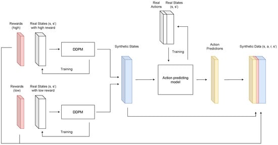- Additionally, data synthesis can be guided by selecting the training data of the diffusion models in order to generate novel, yet realistic, samples of a specific behavior (in our context, samples of either high or low immediate reward). In this respect, the training data may be more balanced, as, in most cases, state–action pairs with an immediate impact on the obtained reward are quite rare.