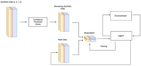 In order to improve the agent’s training and speed up the learning process, the synthetic data are mixed with real samples at the batch level. Specifically, the generated data are stored in a separate buffer and then samples are drawn from both the real and the synthetic buffer to ensure that every batch contains samples from both categories. In this way, there is full control over the training process, as the exact percentage of each category in every batch can be determined explicitly, as opposed to randomly selecting samples from a shared buffer. Therefore, it is possible to further optimize training by selecting the most suitable ratio, as discussed in Section 5.