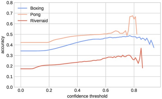 Figure 6 depicts the accuracy of the action-predicting model depending on the confidence threshold for each game. As the selecting condition becomes more strict, the number of samples that can be used for the agent’s training is reduced. This explains, to a certain degree, the decrease in accuracy after a certain threshold (which is expected to increase along with the confidence value), since in this case it is based on a small number of samples. In this respect, there is a tradeoff between the accuracy of the model and the amount of samples to be rejected, as a very small number of synthetic samples may cause overfitting and negatively affect the agent’s training. Therefore, for each game several confidence thresholds have been tested for the respective action-predicting model in order to determine the best configuration.