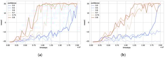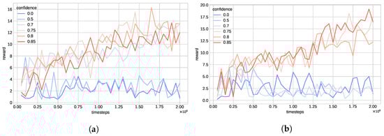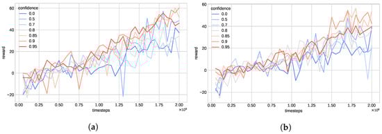 As expected, the confidence value greatly affects the agent’s learning. Higher thresholds lead to a higher accuracy of the prediction model and a lower percentage of incorrect synthetic samples. In this respect, the performance increase along with the increase in the confidence, as highlighted in Figure 7a, seems quite natural. Nevertheless, as discussed above, very high thresholds exclude a large number of samples from the synthetic buffer that could result in the network being trained on the same samples with high frequency. This phenomenon is depicted in Figure 7b, where the synthetic weight is larger, meaning that more synthetic samples are introduced in every batch. In this case, a very high confidence value (specifically the 0.95 configuration) leads to slower learning, while lower values (0.9 and 0.85) result in the agent’s top performance in terms of total reward and timesteps needed to achieve it. Thus, the importance of a balance between the action predictor’s accuracy and the size of the synthetic buffer is highlighted.