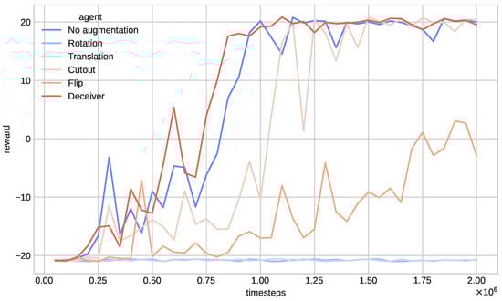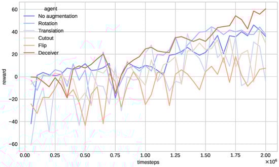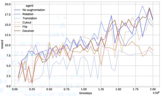 In [27], the agent is trained on artificial trajectories imagined through a learned latent space of the world model, while an extension of the idea is proposed in [11]. The concept of mapping the representation to a latent space is also presented in [28]. In this case, the authors decouple the augmentation process from policy learning in order to benefit from data augmentation without introducing further complexity. A methodology for generating adversarial trajectories, which are combined with the original ones during training, to enhance generalization is described in [8]. In a similar manner, augmented and non-augmented data are used concurrently to jointly optimize the state–action value function based on a redefined objective [29]. Emphasizing the pixels’ correlation with the objective, the authors in [30] propose a methodology for transforming only the less-task-relevant pixels, in order to prevent training instability, and in [31] they employ an auxiliary image reconstruction loss to improve sample efficiency.