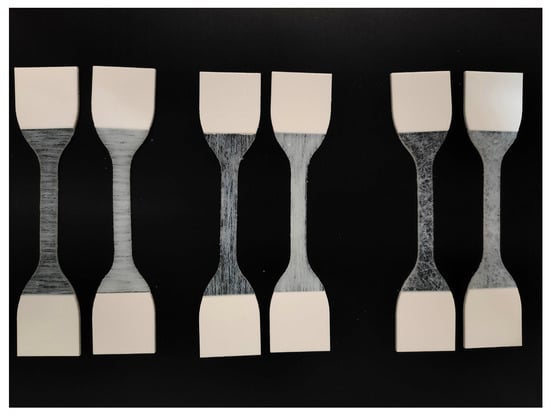 Standardized samples (ASTM D638) with different fiber orientations and concentrations. From left to right, respectively, we have the following: Superficial ( and ), Deep ( and ), and Middle ( and ).