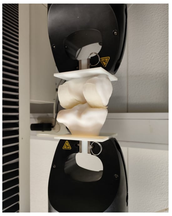 For patient-specific testing (Figure 2), a total of 20 synthetic cartilages were realized, 10 for healthy subjects and 10 for degenerative conditions. Each patient had five cartilages printed with the material and five with the material. Before the test, every cartilage was measured with a digital caliber in six different points: two for the width and four for the thickness. Both the femur and tibia were fixed, and the jaws were positioned to keep the cartilage perfectly in place, as in a physiological condition. To secure the positioning, a pre-load of 650 N was applied to the cartilage. This choice also has physiological justification since the loads acting on the knee joint (for a leg in full extension position) during the standing phase of the gait cycle range from 700 N to 1150 N on average [31]. The compressive load was increased at a uniform rate of 1.3 mm/min along the longitudinal direction until a 20% strain of the total average thickness was reached. After that, the cartilage underwent the same measurements described above. This procedure was carried out for both subjects.