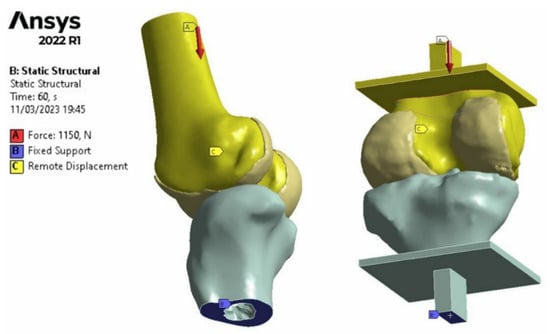 The connections between femur–cartilage and cartilage–tibia were defined as bonded [35] due to a partially mineralized zone between that secure cortical bone and the articular cartilage by anchoring the collagen fibrils of the deep zone to the subchondral bone [1]. Due to the simplification applied to the model, by excluding menisci and tibial cartilages, a pinball region was set to compensate for the gap between the tibia and femoral cartilage. The asymmetric behavior and the augmented Lagrange formulation were used for handling contacts. In the analyses, flexo-extension and varus-valgus rotations were constrained for the femur in order to analyze the knee joint in full extension. The tibia was constrained on the lower surface with a fixed support. A compressive force of 1150 N was applied perpendicularly to the upper surface of the femur, which matches the force acting during a gait cycle for a full extension position [36] (Figure 3, Left). The values of Equivalent Elastic Strain [mm/mm] and Equivalent (von Mises) Stress [MPa] for the femoral cartilage were exported, and the stress–strain graphs were created to analyze the joint behavior with different material properties.