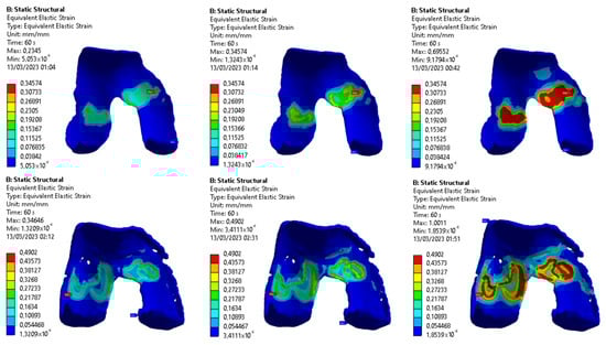 As can be seen in Figure 6, the strain map computed within the femoral cartilage after the simulation using the models with supports closely resembles that of anatomical models without supports, both under identical loading conditions. This indicates that the designed models with supports serve as effective physical simulators for studying the strain of synthetic cartilages.