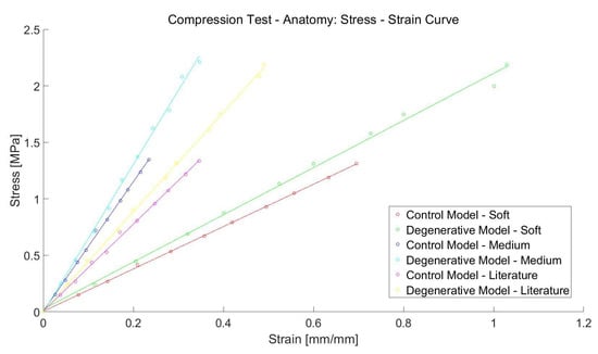 The FEA was used to validate what was measured with the synthetic knee because it allows for a controlled environment, where the geometries are aligned and changes due to OA can show the effect of the degeneration. The results shown in Figure 4 represent the strain distribution on the healthy (upper row) and osteoarthritic (lower row) morphologies taken into account for the computational simulation. material (left column) exhibits the lowest deformation, whereas the one undergoes the highest. Figure 5 reports the linear stress–strain chart for both synthetic and literature materials according to the constitutive model.