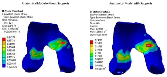 Strain distribution on healthy control cartilages following the computational simulation that differed between the two scenarios. On the left, anatomical models without supports were employed, whereas on the right, models designed with supports were utilized.
