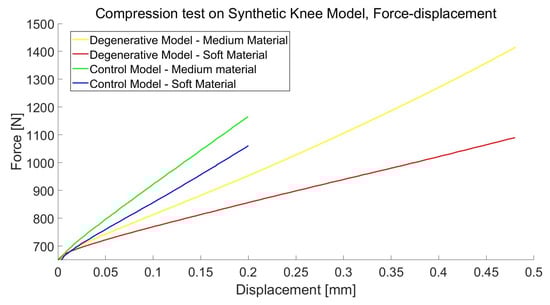 Figure 7 reports the graphs related to the physical simulator setup that was the prototype during the study. The chart was reported as force–displacement since it was not feasible to measure the surface and the thickness of the contacting point. As can be seen, the Degenerative curves lie below the Control ones, despite the different materials. All tests were run until the 20% strain was reached and since the degenerative cartilage had a bigger volume, the final displacement was higher.