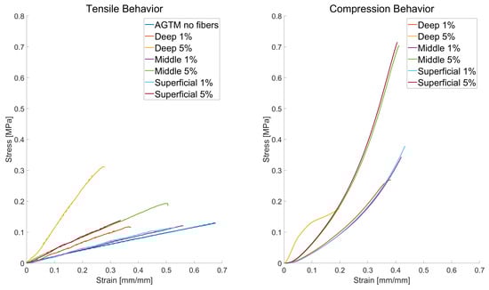 Figure 8 reports the stress–strain curves of the customized specimens with fibers. Under uni-axial compression, the behavior of the groups is similar, with a decreasing failure strain from the outside () to the inside () of the cartilage. The increase in fibers volume content corresponded to an increase in the mechanical performance results: the stress is two times higher compared to the group within the same strain range. Conversely, 5% reported a nearly-linear behavior for small deformations, yielding a transaction around MPa and a failure around strain, making it the less flexible material.