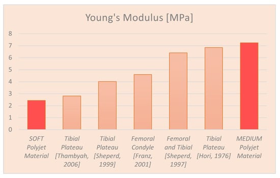 Upon analyzing the Finite Element Analysis (FEA) results in Figure 5, it is evident that the stress–strain curves display a linear trend with remarkably similar slopes. The mechanical performance of biological cartilage tissue is intricately influenced by various factors, such as age, osteoarthritis (OA), and physical activity, making it challenging to establish a standardized mechanical profile [38]. Despite the distinct biochemical composition, the synthetic cartilage demonstrates promising overall elastic properties, thanks to the manual tunability achieved by adjusting the proportions of elastic or gel-like materials. This adaptability allows for the calibration of synthetic cartilage to match the desired reference values. The results position the printed materials as the endpoints on a spectrum, with representing the lower limit and representing the upper limit of the mechanical properties akin to knee joint cartilage (Figure 9). As stresses and deformations escalate, the impact of geometric variations becomes more pronounced, underscoring the role of osteoarthritis in modifying the mechanical response of cartilage [37]. These insightful comparisons underscore the potential of 3D printing and synthetic materials in effectively mimicking the elastic properties of natural cartilage tissue.