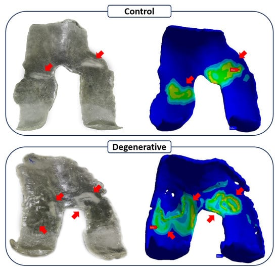 Furthermore, the stress on the tissue is unevenly distributed as can be observed in our analyses. The deformation is also increased in damaged areas since OA conditions bring wear and degradation. The strain distribution from the FEA (Figure 10) reveals the brittle regions of patient-specific cartilage during an extended-leg stride. As a first insight of this potential, we can qualitatively assess that the area experiencing higher deformations is much thinner and more convoluted in the degenerative knee, a consequence of the uneven load distribution between bones and cartilage.