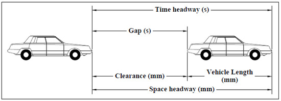 After obtaining the distances between two consecutive vehicles, hereafter referred to as “Clearances”, the analysis of data began by comparing ACC-equipped and human-driven vehicles through illustrative figures. The relationship between clearances and the corresponding driving speeds was also depicted to better investigate the differences. Subsequently, other traffic flow parameters such as space headway, time headway, density, and flow, as defined in ref. [32] and shown in Figure 4, were calculated using the relevant equations as follows: