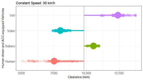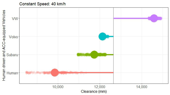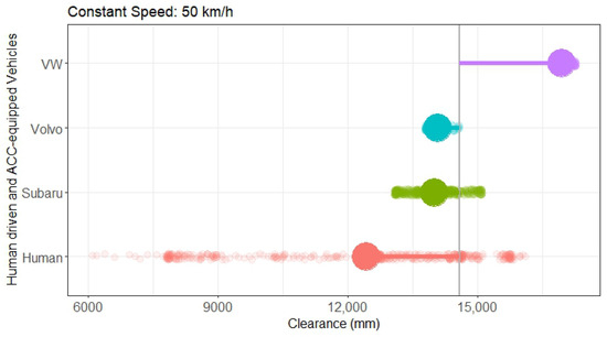From the above illustrative figures, it is evident that clearances obtained by human-driven vehicles (red) are shorter than those of all other ACC-equipped vehicles at this low range of constant speeds. The average clearances for human-driven vehicles were only 7514, 9846, and 12,420 mm, respectively. Vehicles equipped with Volvo’s combined camera and radar ACC sensor recorded the closest average clearance, measuring 7985 mm at 30 km/h. As the driving speed increased, Subaru achieved the second-shortest average clearance, measuring 10,537 mm at 40 km/h and 11,732 mm at 50 km/h, utilizing Eyesight technology. Conversely, VW demonstrated safer following distances using radar ACC during this phase of the experiment, with all individual average values falling below the overall average line.