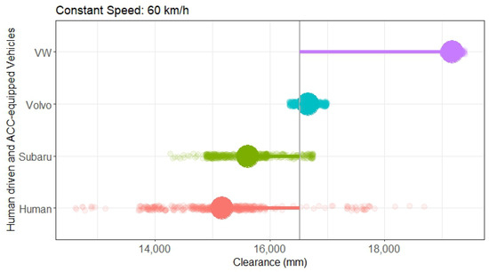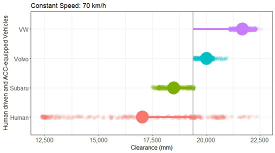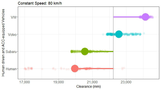In the next phase of the experiment, the vehicles’ performance was tested at medium constant driving speeds of 60, 70, and 80 km/h. The results showed a consistent pattern of shorter clearances, with the following order for the mentioned speeds: Human-driven, Subaru, Volvo, and then VW. The minimum differences in average clearance between the human-driven and the nearest ACC vehicle for the three speeds were 451, 1456, and 587 mm, respectively. Meanwhile, the maximum differences between the human-driven and the farthest vehicle were recorded as 3567, 3200, and 3588 mm, respectively. Figure 8, Figure 9 and Figure 10 illustrate the performance of vehicles to provide the shortest clearances during driving at medium speeds.