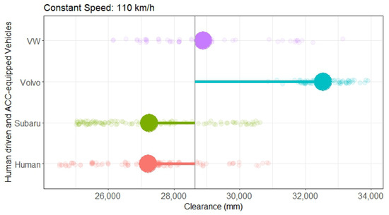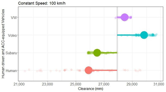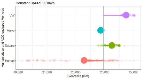 Later, at high-speed ranges of 90, 100, and 110 km/h, human-driven vehicles continued to follow the leading vehicle at closer distances. In contrast, ACC vehicles exhibited varying following behavior. For example, at 90 km/h, Volvo was the second vehicle to generate the shortest distances ahead, while at 100 and 110 km/h, it provided the largest average clearance among the vehicles. Subaru, on the other hand, closely mirrored human-driven behavior at the maximum test driving speed of 110 km/h, with recorded average clearances of 27,247 mm for Subaru and 27,211 mm for the human-driven vehicle. The oscillation behavior exhibited by ACC vehicles at high speeds may become a limitation to their performance. Figure 11, Figure 12 and Figure 13 depict the distribution of the clearances at the high range of driving speeds.