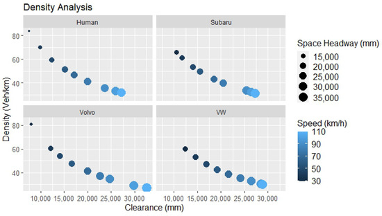Figure 15 and Figure 16 summarize the results of the entire study, encompassing all analyzed measurements to facilitate a comprehensive comparison of relevant parameters. Figure 15 illustrates the relationship between clearance and density, demonstrating a smooth decrease in density with the gradual increase in clearances resulting from the incremental rise in speed for all tested vehicles. Conversely, Figure 16 depicts the impact of increasing clearances on capacity, indicating the time headway by the size of the dots in the graph.