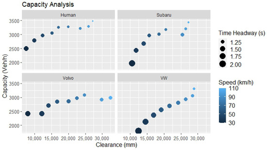 The graph portrays an almost seamless increase in capacity with respect to the growing speed and subsequently increased clearances for both human-driven and VW vehicles. Subaru follows a similarly smooth trend in the graph, except at 90 km/h, where a sharp drop occurs. This can be attributed to the relatively high difference in time headway, when 1.136 s and 1.207 s were reported at driving speeds of 80 km/h and 90 km/h, respectively. In contrast, Volvo yielded more oscillated capacity results due to its reliance on time settings of ACC rather than distance settings as for Subaru and VW.