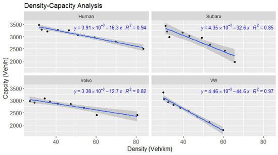 At the end of our analysis, Figure 17 provides a comprehensive depiction of the intricate relationship between capacity and density across all driving modes, examined under driving speeds. This visual representation serves to underscore and elucidate the assertions made earlier in our investigation, specifically focusing on the performance of vehicles with respect to car-following behavior. As discerned from the data presented in Figure 17, both human-driven vehicles and VW demonstrated notably superior values, attaining 0.94 and 0.97, respectively. In stark contrast, Subaru and Volvo vehicles exhibited lower values of 0.85 and 0.82, respectively. This discrepancy in values underscores the distinctive car-following behaviors exhibited by these vehicle types under the conditions of our study, with human-driven and VW vehicles outperforming their Subaru and Volvo counterparts. Such insights contribute to an understanding of the dynamics associated with different driving modes and vehicles in the context of field driving speeds and car-following behavior.