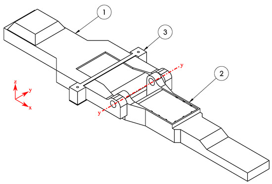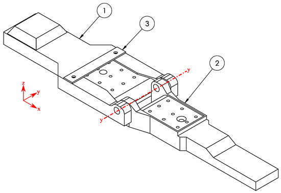 Isometric assembly drawing of the programming device version 1 used in the experiments. With the components: (1) the base lever, (2) the rotating lever, and (3) the slidable hold down mechanism. Outer dimensions: × × .