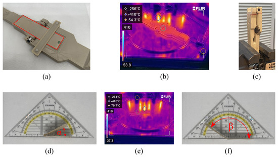 Figure 5. The process chain for the experiments: (a) placing the hinges (marked in red) in the programming device (both made from PEEK), (b) heating the hinges and the device and measuring the surface temperature, (c) bending/folding the hinges and letting them cool down in the vice to keep the stress applied (alternatively, in the third experiment on the influence of rapid cool down, the hinges and the device are submerged in water), (d) measuring the achieved fixed angle , (e) reheating the hinges, and (f) measuring the achieved recovered angle .Subsequently, the hinges will recover their deformation at the same temperature and time duration as the initial programming. The recovered angle will be measured to calculate the recovery ratio (). is the angle between the inner two surfaces of the hinge, with 180° being the largest possible angle (perfect recovery) and being the smallest possible angle (no recovery at all). The recovery ratio () is calculated using the formula:This experiment aims to determine the optimal temperature and minimum time required for effective programming. - (b)