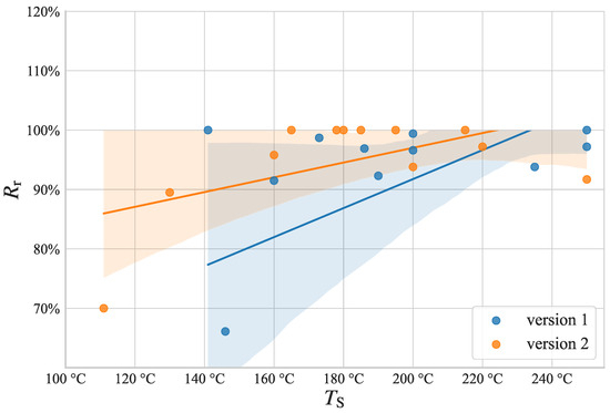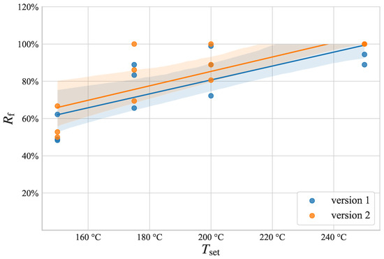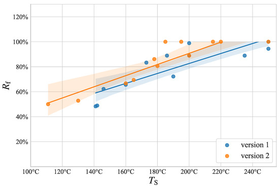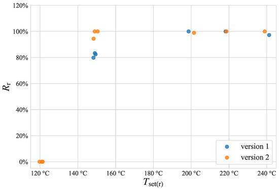 A notable distinction between the first and second iteration programming device was evident, with the second iteration consistently outperforming the first. The second iteration achieved a 100% programming ratio more frequently and at lower temperatures, underscoring the positive impact of design modifications. In Figure 9, an independent assessment of the programming results, irrespective of the measured surface temperature, vividly showcased the enhanced performance of the second version of the programming device.