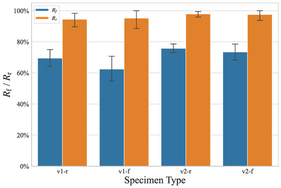 Unfortunately, the results presented in Figure 13 reveal a close-to-negligible or only a slight negative influence of the forced cool-down method on both the recovery ratio () and folding ratio (). Despite the expectation that the forced cool-down method could expedite the cooling process, the hinted worsened performance casts a shadow on its practical benefits. The slight negative impact observed in the 4D printing performance following forced cool-down experiments could be attributed to several factors. Rapid cooling rates may induce thermal stress, potentially leading to incomplete shape fixation. Additionally, variability in cooling conditions introduced by the forced cool-down method might contribute to the observed performance variation.