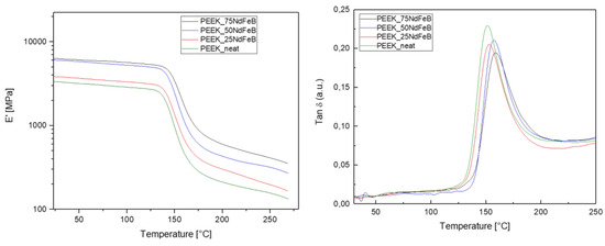 “DMTA results: Storage modulus (left) Tan tan (right) of PEEK_NdFeB filaments” by Pigliaru et al. [12], licensed under https://creativecommons.org/licenses/by/4.0/, (accessed on 13 September 2023) (CC BY 4.0).
