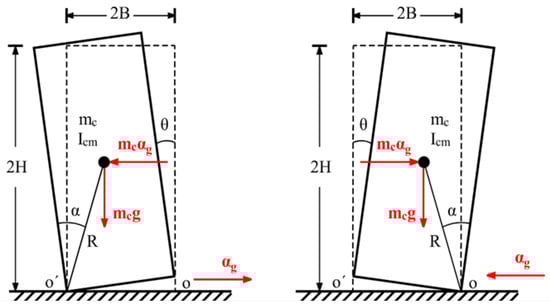 1] highlighted the key features of rocking block dynamics. In particular, the initiation of the rocking effect under earthquake loading necessitates a minimum threshold of acceleration, the value of which is contingent upon the system’s geometry. After uplift, the system exhibits negative stiffness, attributable to its self-weight acting as a restoring force. Due to the negative stiffness, the vibration period of a rocking oscillator is not constant but continually varies, depending on its rotation, while the stability of rocking bodies is governed by scale-size effects. With the recognition of the beneficial effects of rocking response on the seismic performance of structures, a plethora of researchers have studied the phenomenon [