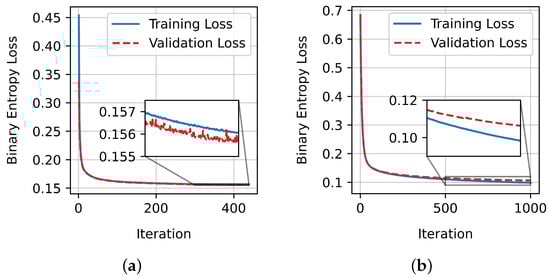 Figure 5 shows the evolution of the training loss of the two examined classifiers. The training stops either when the maximum number of iterations is reached, or when the gain in the validation loss, i.e., the loss measured on a holdout subset of the training set, becomes too small compared to the gain in training loss, i.e., when there is the risk of overfitting. Overfitting would manifest with a significant gap between the training and validation loss curves (generalization gap). However, as can be readily observed, the two curves are very close in our case, so no overfitting has occurred. Finally,