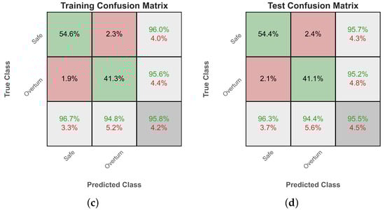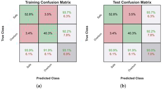 The best-performing classifier, gradient boosting, achieved an overall accuracy of . This fact indicates the overall success of the algorithm to accurately assess the safety of the rigid rocking block under seismic excitation. In addition, the classification metrics are approximately equal for both classes, enhancing the reliability of the predictions.