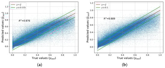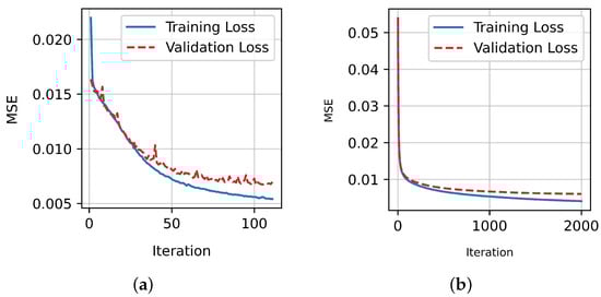 Figure 9 displays the evolution of the mean squared error of the two best-performing regressors. There is no significant gap between the loss on the training and validation datasets; thus, the algorithms did not overfit.