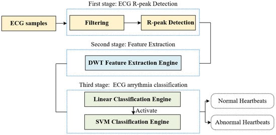 The proposed system consists of three main stages: ECG R-peak detection, feature extraction, and ECG arrhythmia detection, as shown in Figure 1.