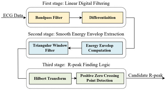 In the first stage, the ECG R-peak detection stage is responsible for signal preprocessing and R-peak detection. ECG signals are often contaminated by various types of noise in realistic environments, such as power line interference, electrode contact noise, motion artifacts, muscle contraction, and baseline drift [33]. Hence, the first step is to apply a bandpass filter with 1–40 Hz cutoff frequencies based on empirical results to the raw ECG signal, which isolates the predominant QRS energy centered at 10 Hz.