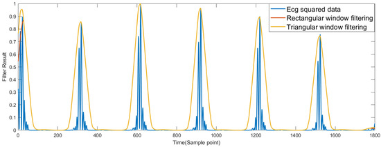 In addition, we also used MATLAB to compare the results of filtering with the rectangular window twice and the triangular window. It can be seen from Figure 3 that the two lines overlap, and they are equivalent in terms of filtering effect.