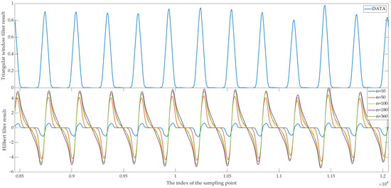 Second, the method of zero-phase filtering mentioned in the literature [37] was substituted by triangular window filters, which can make the envelope smoother and sharper. The specific method are to perform two forward and backward rectangular window filters on the data. The original data s is convolved with the rectangular window to obtain s′. The data of s′ is reversed to obtain sr′, and then sr′ is convolved again to obtain s″. The filtered result is obtained by reversing s″, as shown in the following equation.