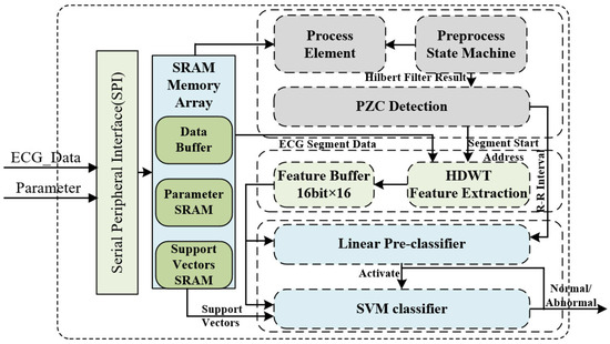 Figure 6 illustrates the overall architecture of the proposed processor, primarily comprising three modules: the ECG R-peak detection engine, the feature extraction engine, and the hybrid ECG classifier. The R-peak detection engine includes the process element (PE), the R-peak detection state machine, and the positive zero-crossing (PZC) detection engine. The hybrid ECG classifier includes a linear pre-classifier and a SVM classifier. In addition to these modules, the SPI are employed for loading parameters and ECG raw data, while the SRAM (static random access memory) serves to store raw ECG data, immediate data, filter coefficients, and SVM parameters.