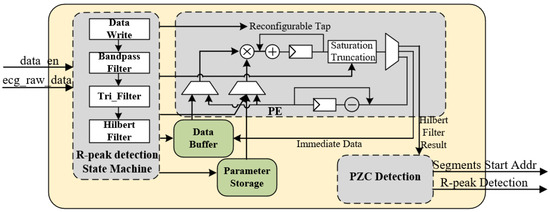 Figure 7 shows the detailed architecture of the R-peak detection engine, which comprises five components: the R-peak detection state machine, process element (PE), data buffer, parameter storage, and positive zero-crossing (PZC) detection unit. We utilize a 1-KB SRAM for the data buffer, which stores both raw ECG and intermediate data. The filter coefficients are stored in the parameter SRAM. The computational flow is controlled by the R-peak detection state machine. To enhance resource utilization, each computational stage shares the same PE.