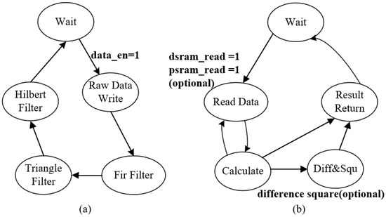 Figure 8a depicts the state diagram of the R-peak detection state machine. This FSM (finite state machine) controls every intermediate FSM at every stage. It primarily comprises four components: raw data write, bandpass filter, triangle filter, and Hilbert filter. In each intermediate filtering stage, data reading, calculation, and data return are necessary. The difference and square operation are optional.