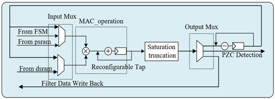 Computation is performed by the process element (PE). As shown in Figure 9, the PE comprises a multiplier, an accumulator, a subtracter, a saturation and truncation unit, and an input/output multiplexer. The operation of PE follows the INT16 format. To address the issue of overflow, we employ saturation and truncation.