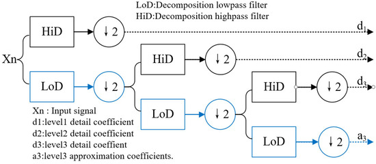 The HDWT can be calculated by filtering the signal, followed by a down-sampling process as shown in Figure 10. The signal is partitioned into approximation coefficients, which correspond to the low-frequency signal, and detail coefficients related to the high-frequency portion. After interactions, we achieve the desired resolution level.