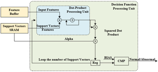 For hardware implementation, we have a large time margin for calculation due to the long interval between heartbeats. To reduce hardware resources, we propose the SVM classifier architecture shown in Figure 13. The data format used for computation are 32Q16. Through MATLAB simulation, converting the data format from MATLABs double type to 32Q16 for hardware implementation caused some precision loss, but it was within an acceptable range.