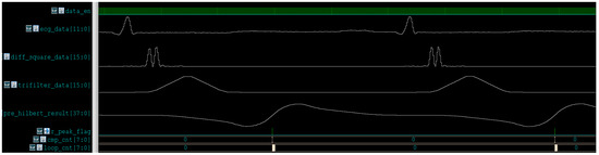 The VCS simulation waveform of the computation process corresponding to this processor is shown in Figure 14. The data_en signal indicates that the SPI interface have received a new ECG signal. The ecg_data, diff_square_data, trifilter_data, and pre_hilbert_result signals, respectively, represent the signals in each process of the first stage. The r_peak_flag signal indicates the R-peak detection signal. The non-zero width of the cmp_cnt signal represents the feature extraction process. The non-zero width of the loop_cnt signal represents the SVM classification computation process. As shown in the figure below, the main delay is the phase delay of the filter, and the delay ratio of feature extraction and classification is very small; it is only 8.16 ms under the 1 Mz operating frequency.