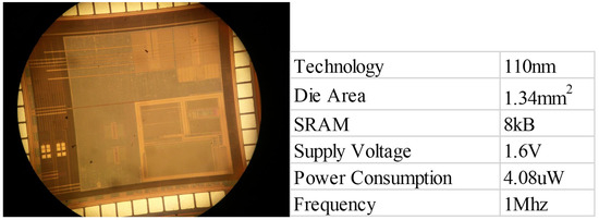 The proposed processor is manufactured on the HHGrace 110 nm CMOS process. The die photograph and specification are shown in Figure 15. The design occupied a total core area of 1.34 mm2 and consumed a total statistical power of 4.08 μW. It integrates 8 KB of SRAM.