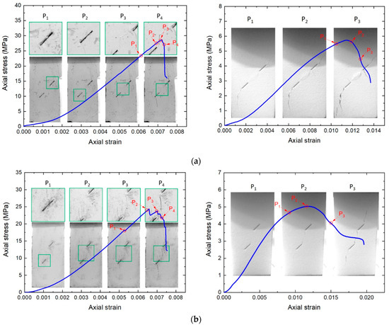 - The crack initiation and propagation processes of 3DP samples are generally consistent with the findings based on the moulded gypsum or other brittle rocks in the literature [51,61,62,63,64,65,66,67,68].