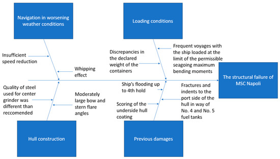 Ishikawa’s diagram was used as a graphical analysis of the effect of factors and their interrelationships that cause a specific problem, as well as an analysis of the effects caused by the operation of such relationships [41]. The diagram arranges the causes chronologically and logically according to the defined problem. The tool was used to examine the accident of MSC Napoli in 2008. The data to perform the analysis were obtained from the accident investigation report introduced in [42].