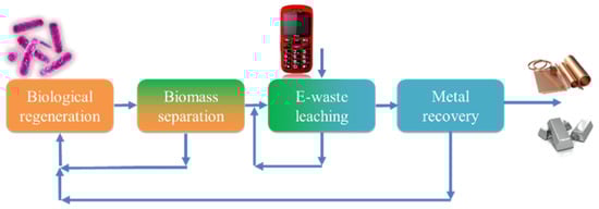 The annual production of WEEE surpasses 40 million tons [3], with a projected yearly volume increase of 3–5%, which is three times faster than the growth of municipal waste [4]. Printed circuit boards (PCBs) and lithium-ion batteries (LIBs) within WEEE are notable for their valuable metals. PCBs consist of a copper-clad laminate with 40% metals, 30% organic materials, and 30% ceramics. Copper, constituting 34.5% of this composition, remains in high demand due to its diverse applications in electronics, vehicles, and power generation [5]. Although the consumption of copper reached 23.5 million tons in 2017, mine production lags behind at 20 million tons, with China being the largest consumer [6]. Current methods employed for metal recovery from PCBs and LIBs have limitations. Pyrometallurgical techniques, being energy-intensive and expensive, contrast with hydrometallurgical processes involving hazardous chemicals and high costs [7]. Bio-hydrometallurgical processes show promise for metal recovery from ores and WEEE, proving effective and eco-friendly [8,9,10,11]. The mechanisms of the bioleaching processes have been widely studied in the recovery of metals from minerals, whereas it has been relatively less studied in the recovery of WEEEs.
