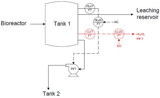 - Tank 1: This is a storage tank that collects the bioreactor’s output and transfers it to the leaching stage as needed. It includes a high-level sensor (HLvTFT) to indicate when it is full and a low-level sensor (LLvTFT) to signify insufficient leaching agent volume for leaching: