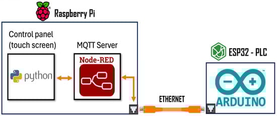 A general view of the different control devices on the plant is depicted in Figure 8. The basic and standalone closed loop control of the physical parameters is performed by an Arduino like device rugged for industrial environments (ESP32-PLC), this device manages the readout of the different sensors and control of the different pumps and actuators. Any rugged hardware platform could be used for control and acquisition. Additionally, since the programming is based on Arduino, transitioning to other platforms should be straightforward. The control and acquisition information are sent using the standard MQTT protocol to the embedded computer (Raspberry Pi) running a Node-Red server. Using the publish/subscribe methods the messages and control transmission is simplified. The communication is performed on a local ethernet network with no external connectivity. The last element is the touch panel displaying all information on the Raspberry Pi computer. A simplified pictogram of the plant enables the user to control and display information of the different elements of the plant. This visualization and control software is programmed in the python language. Lastly, the computer also acts as an intermediate server, regularly updating the database on the main server through WebSockets connection.